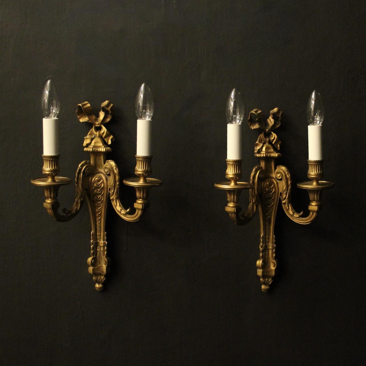 An English pair of gilded bronze twin arm antique wall sconces, the square gauge leaf clad scrolling arms with reeded trumpet bobeche drip pans and bulbous reeded candle sconces, issuing from tapering foliated backplate with decorative pierced ribbon finial, lovely original patination. Fully rewired and PAT tested. All our wall lights come with aged brass screws for fixing and spare bulbs.