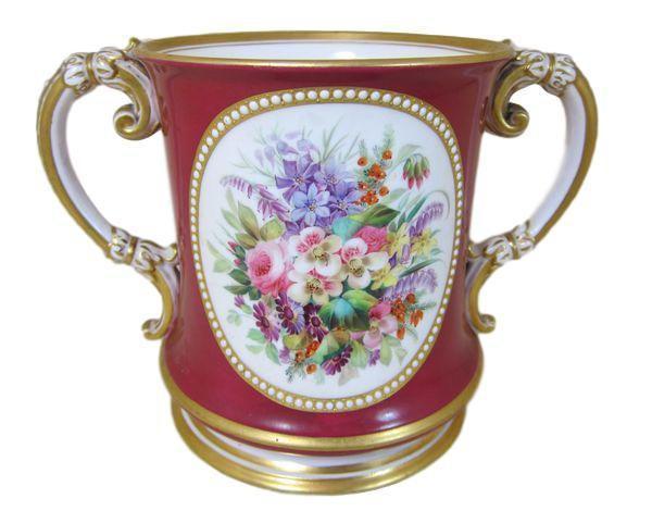 English Porcelain 2 Handled Loving Cup with Floral & Verse Decoration