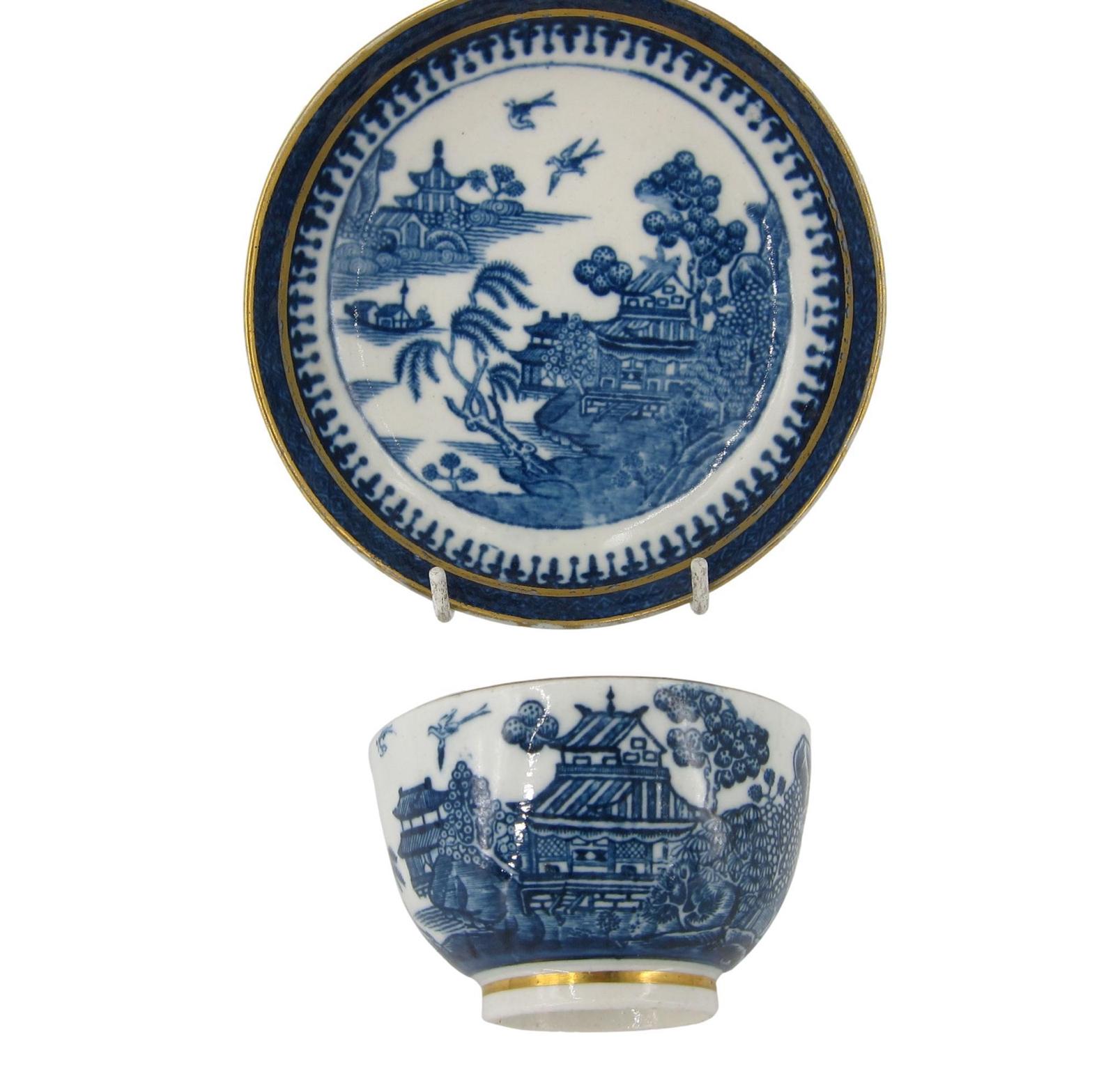 English Porcelain Blue & White Printed Pagoda Pattern Tea Bowl & Saucer