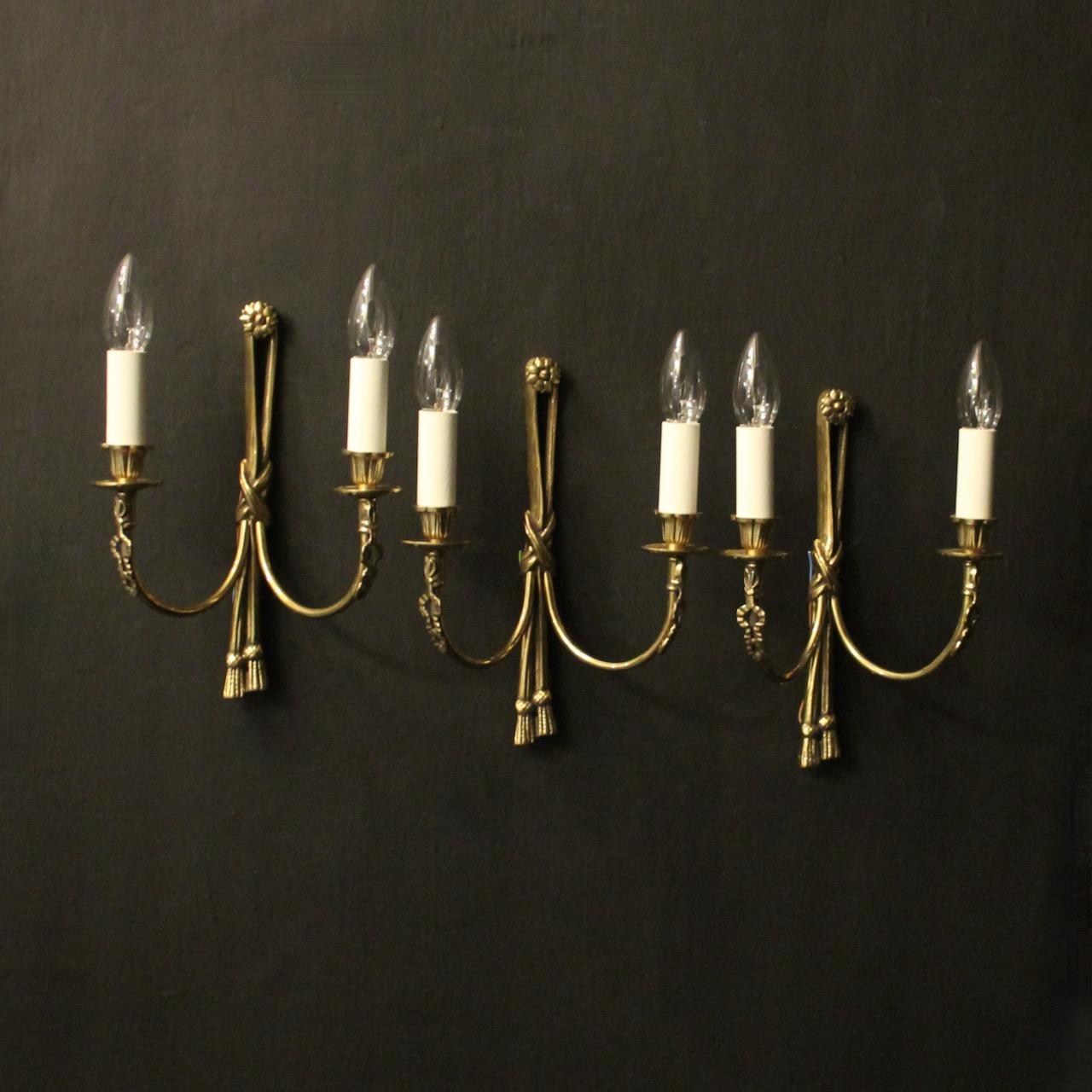 English Set of 3 Brass Twin Arm Wall Lights