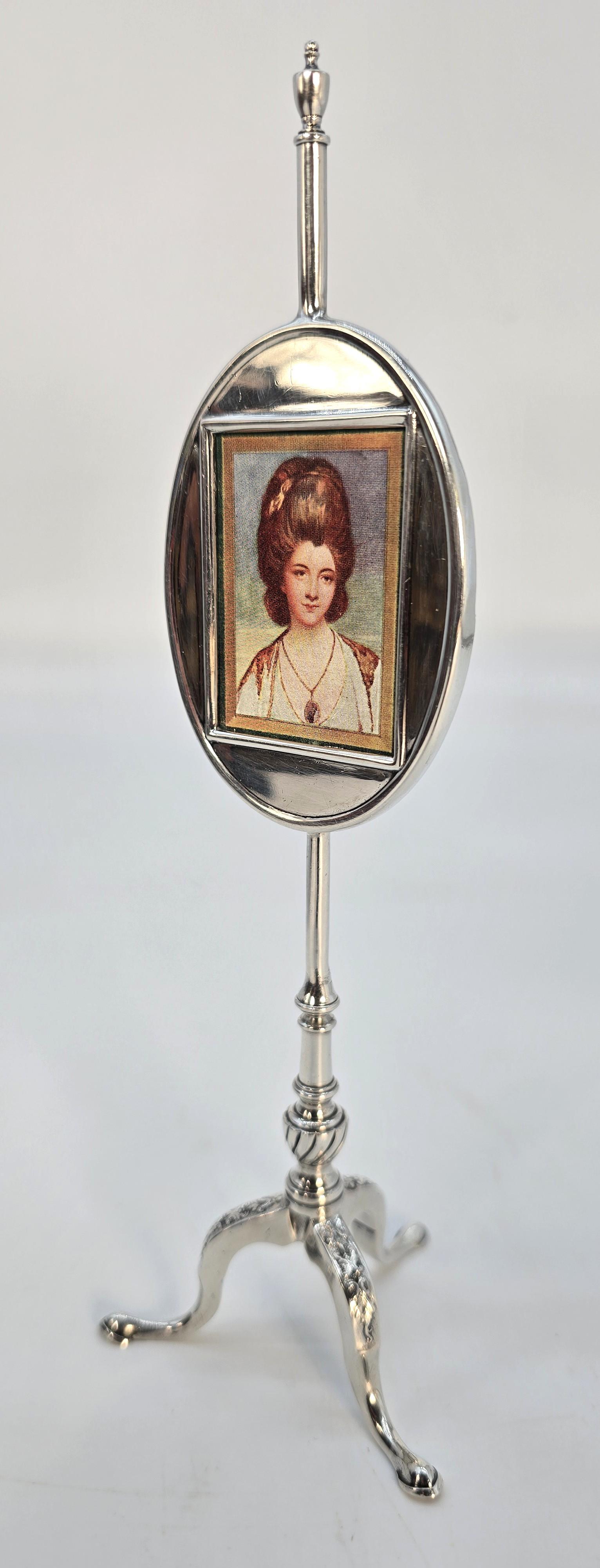 This rare silver, fully hallmarked, highly collectable English novelty piece of miniature George III furniture is a photograph frame or stand. It has been made in the form of a high quality English pole screen originally dating to 1760.