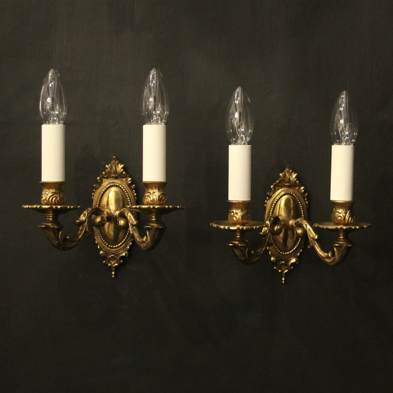A small English pair of gilded brass twin arm wall lights, the leaf scrolling arms with circular bobeche drip pans and bulbous candle sconces, issuing from an ornate oval millgrain and leaf backplate. Nice small scale. Fully rewired and PAT tested. All our wall lights come with aged brass screws for fixing and spare bulbs.