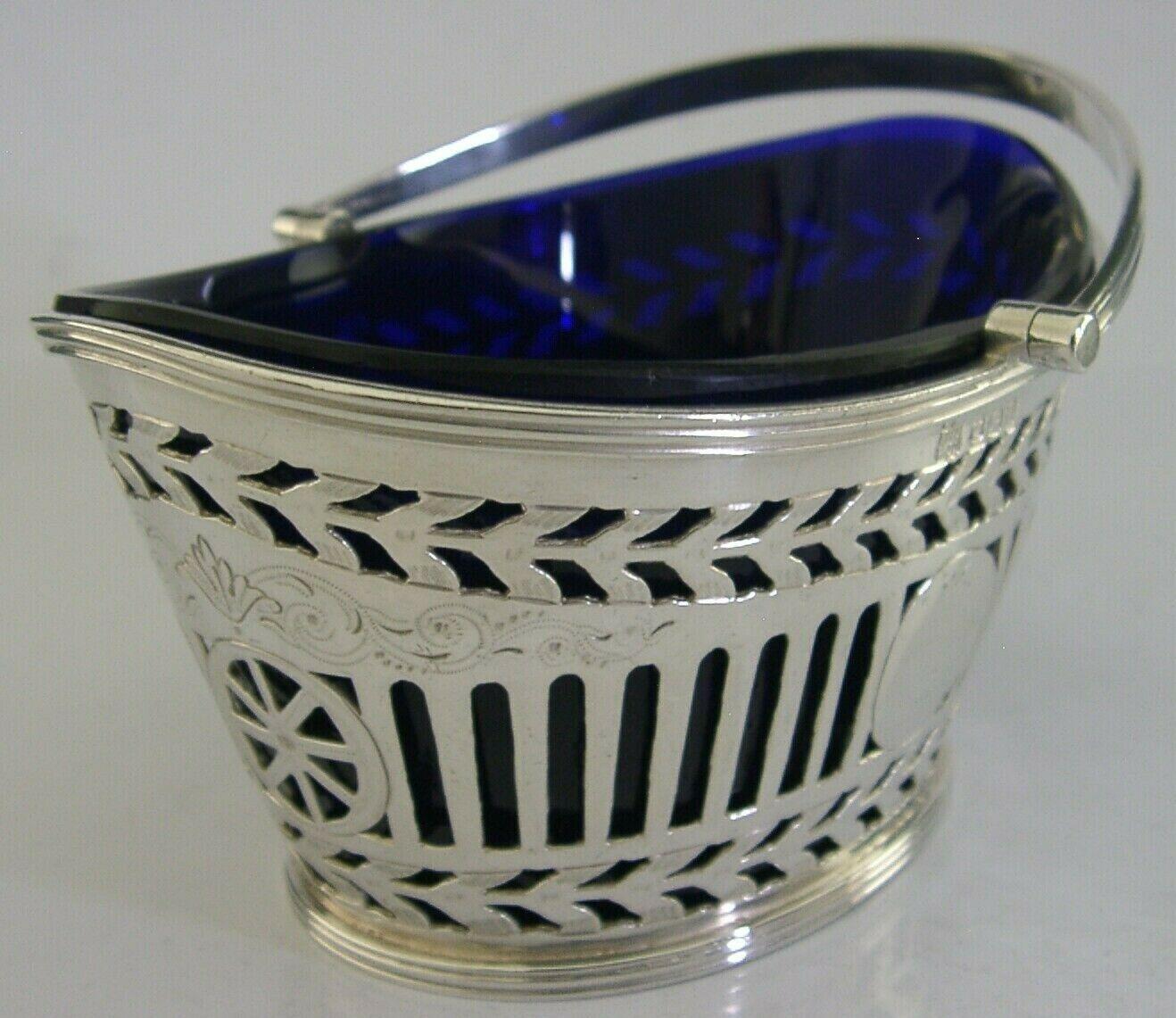 English Sterling Silver Blue Glass Swing Handled Basket Bowl 1898 Antique
