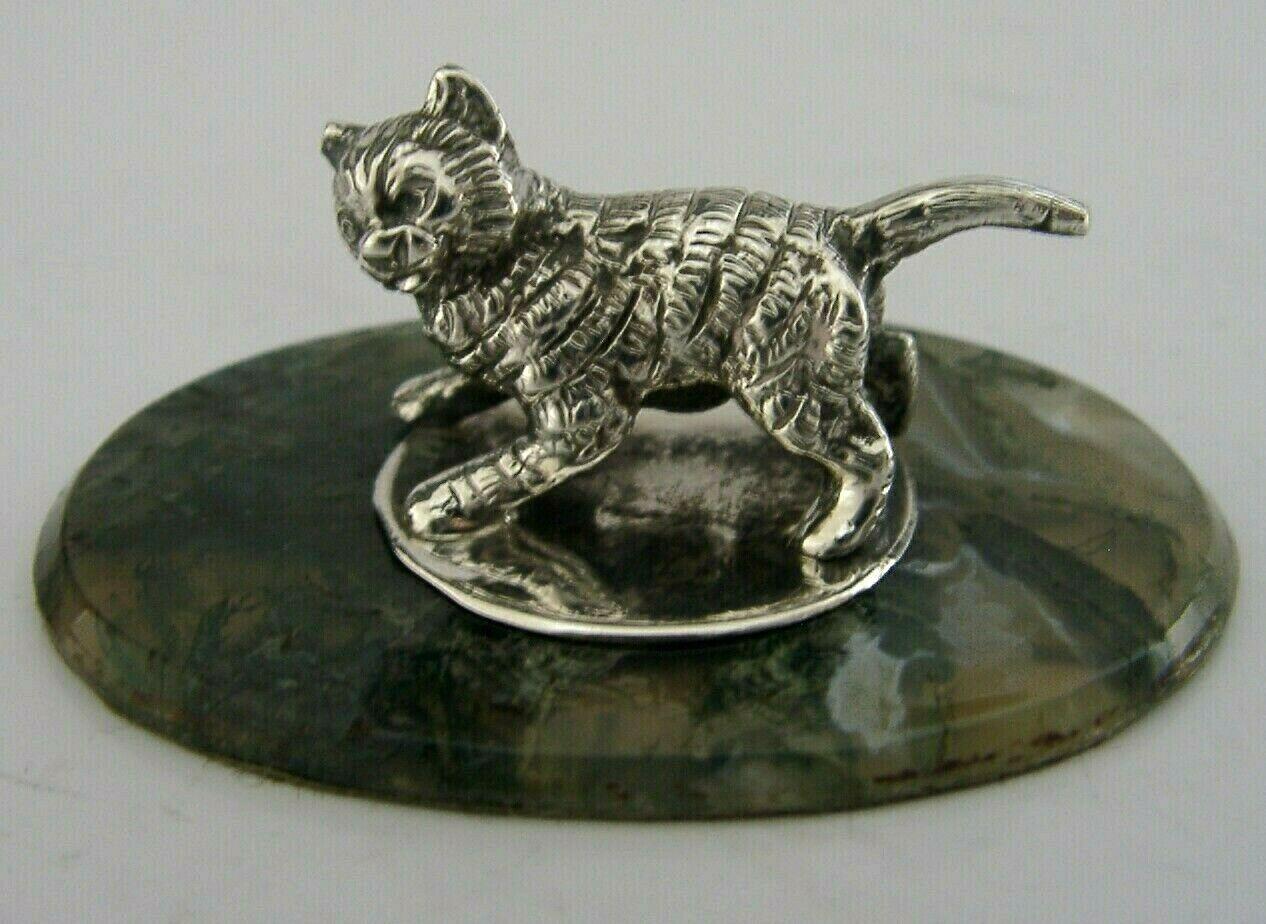English Sterling Silver Cat Kitten Animal Figure Moss Agate Base 1911 Anitque