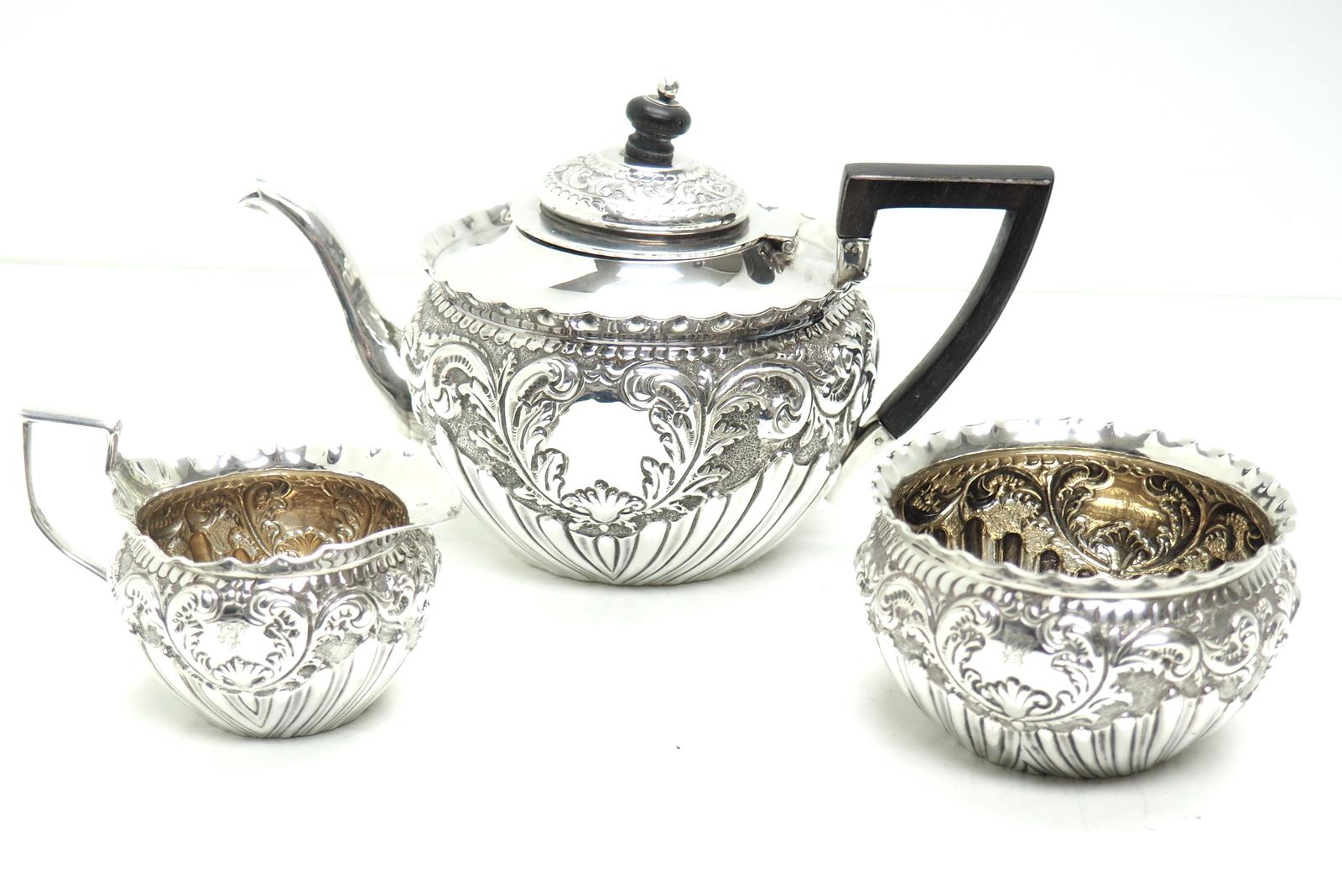 English Victorian Antique Solid Silver Tea Set, Embossed Decoration c.1890