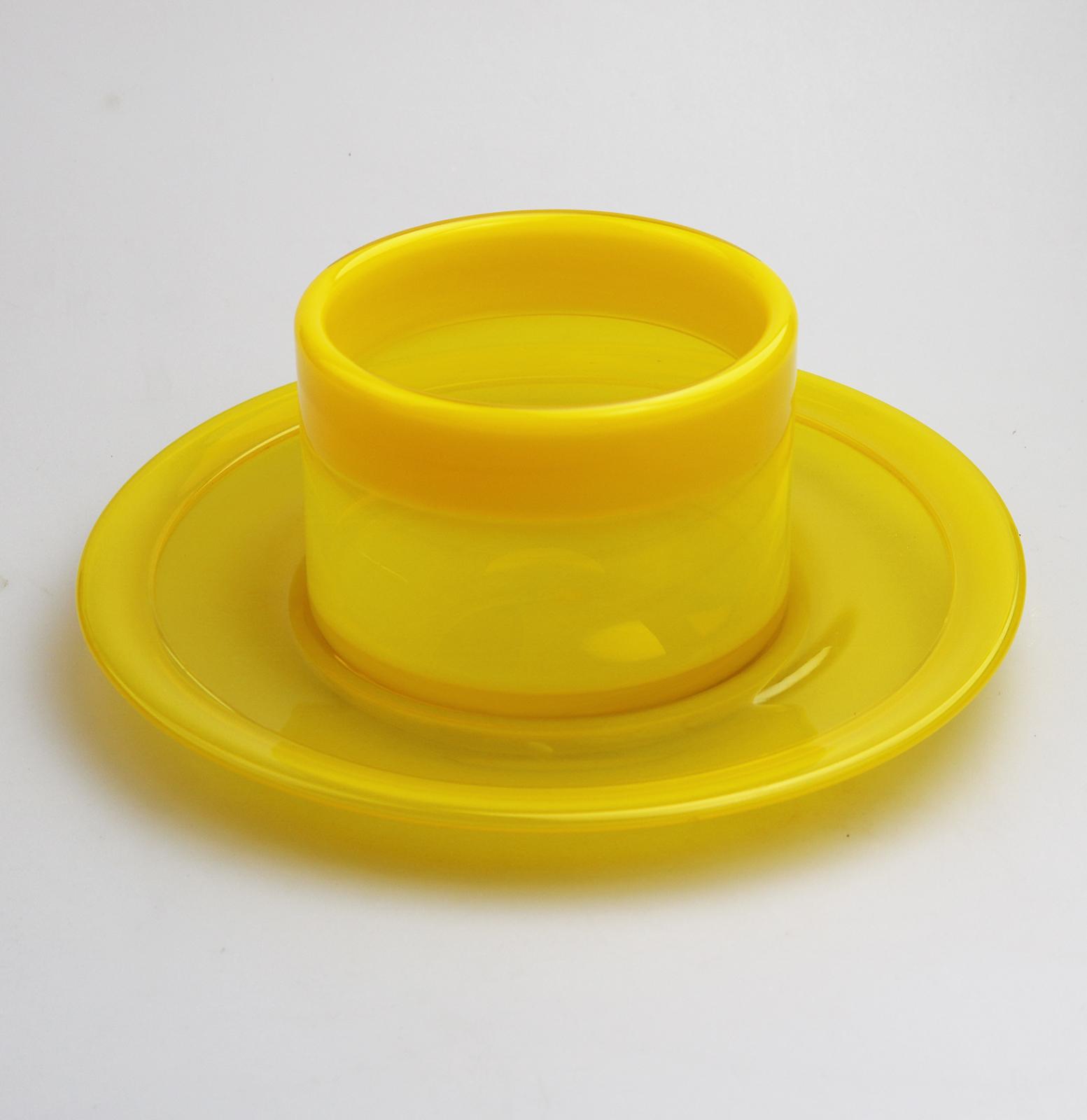 Erik Hoglund : Scandinavian Kosta Boda Art Glass Large Canary Yellow Bowl & Saucer c.1960