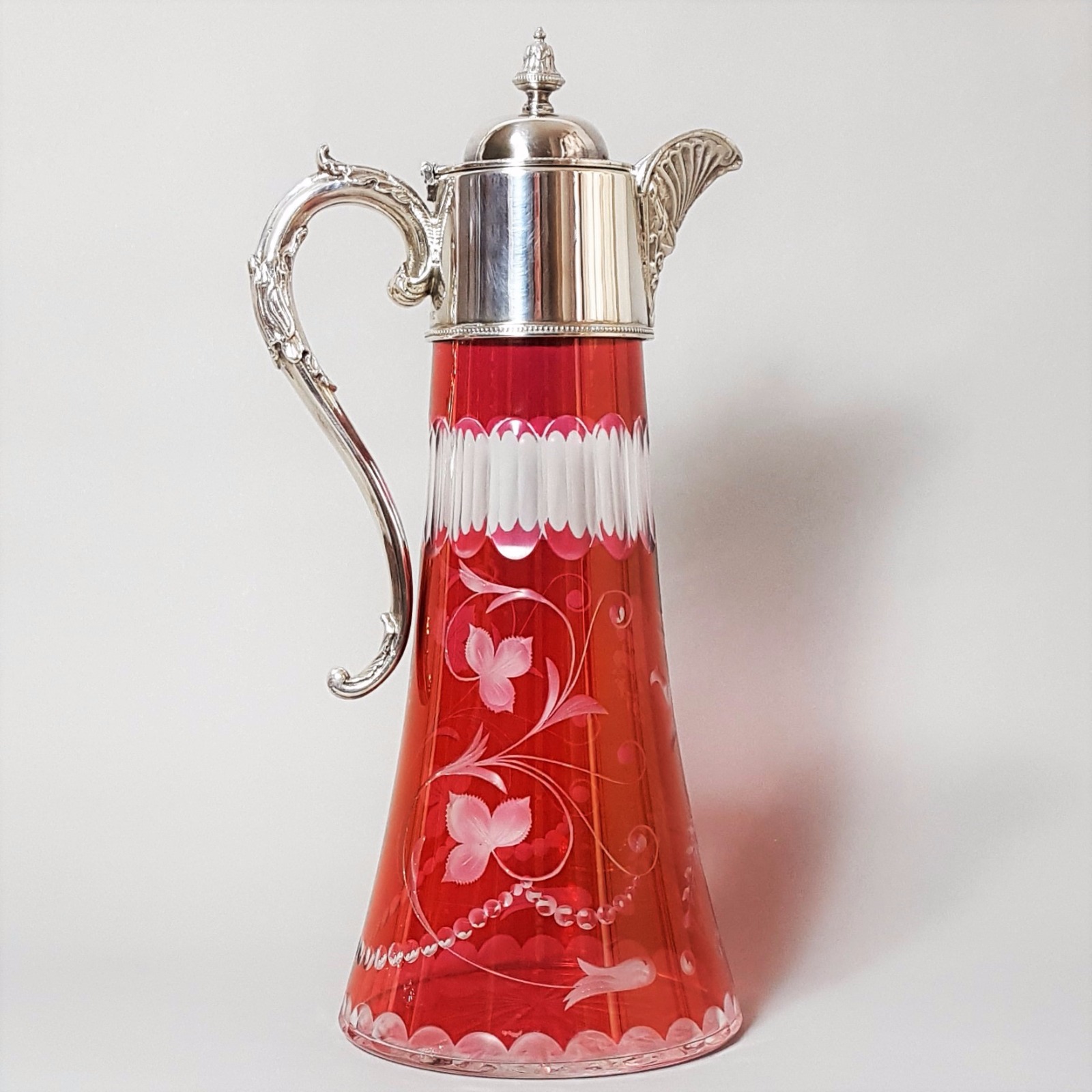 Etched Cranberry Glass & Silver Plate Claret Jug (Pt & Co) C.1862