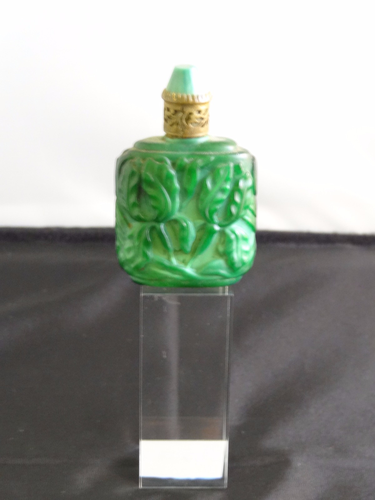 European Moulded Glass Scent Bottle, Milky Emerald Tones C.1920