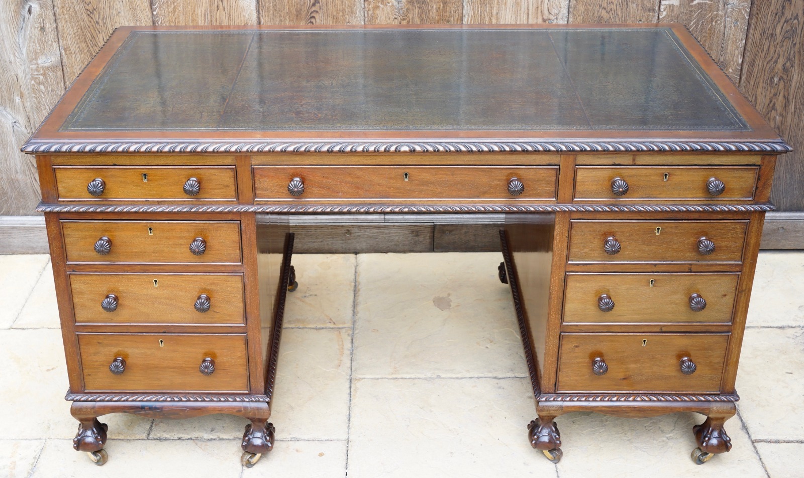 Excellent Quality Solid Mahogany Three-Piece Pedestal Desk with Finely Carved Detail Supported On Eight Claw & Ball Feet C.1920