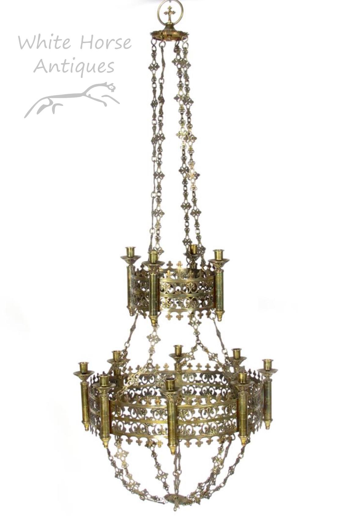 Exceptional Antique Gothic Brass Two Tier Chandelier after Augustus Pugin