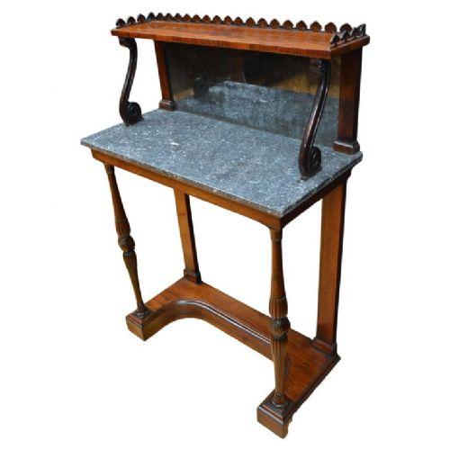Exceptional Irish quality early 19th Century Regency antique rosewood console table of slim proportions, with a inverted heart shaped gallery to the top shelf,