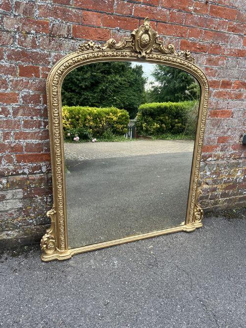 Exceptional Large Antique English 19th Century Carved Wood & Gesso Arched Top Gilt Overmantle Mirror