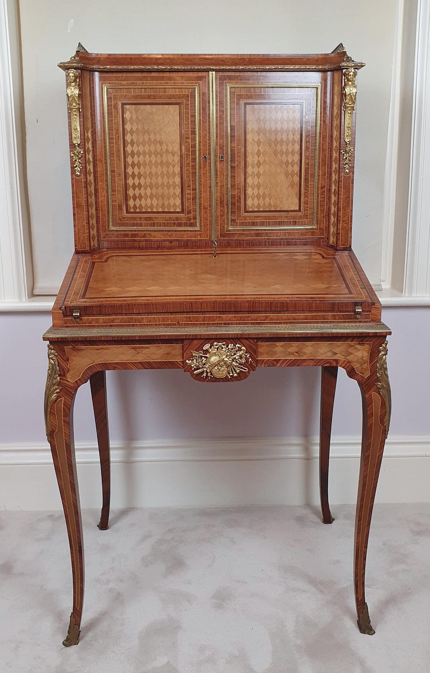 Exceptional Late 19th Century Museum Quality Ormolu Mounted Diamond Parquetry Inlaid Satinwood, Tulipwood & Kingwood Bonheur du Jour