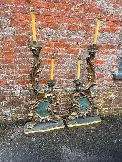 Exceptional Pair of Early Antique Italian Carved Wood Gilt & Painted Large Lamps