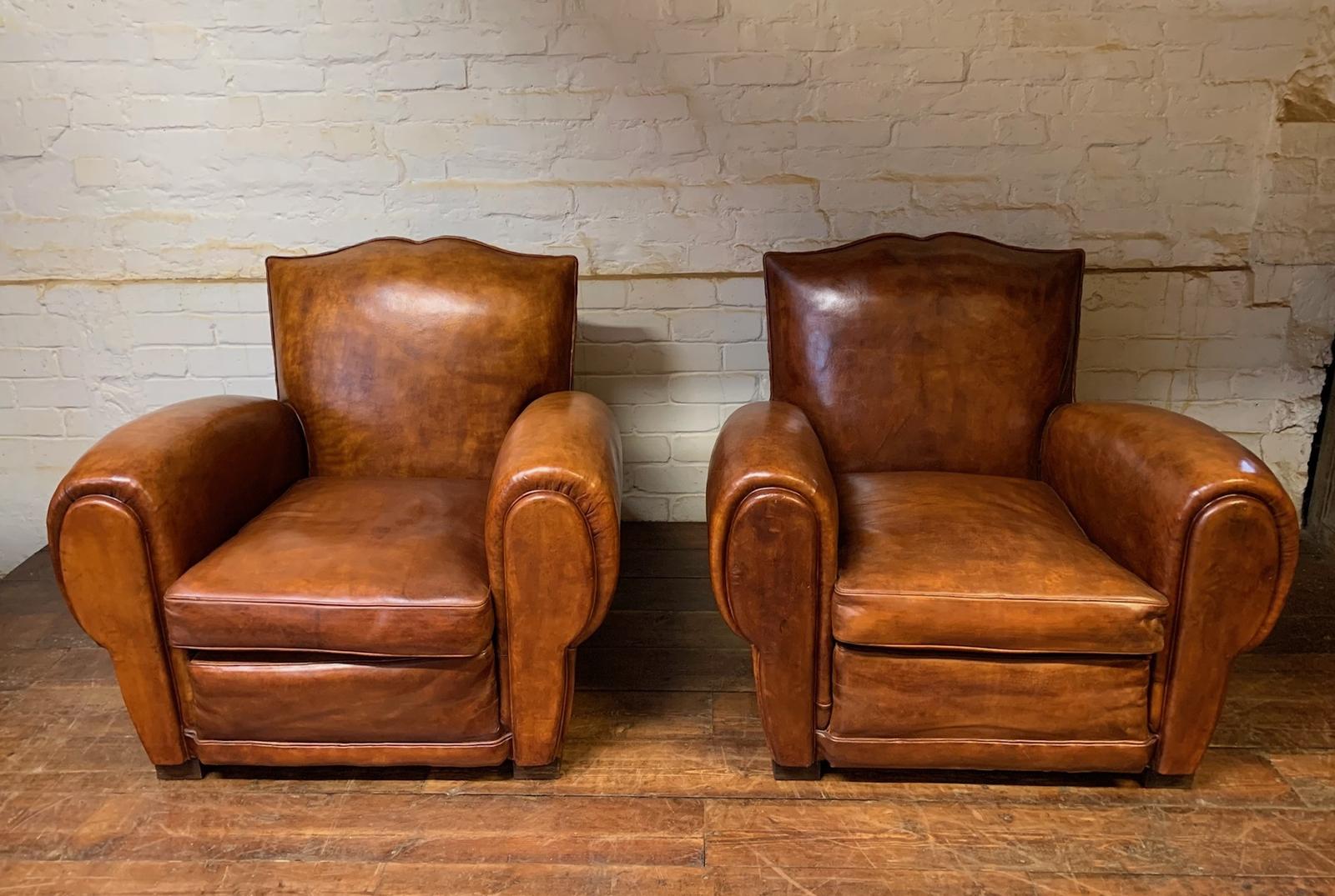 Exceptional Pair of French Leather Club Chairs, Havana Moustache Models with Cuban Cigar Arms c.1940