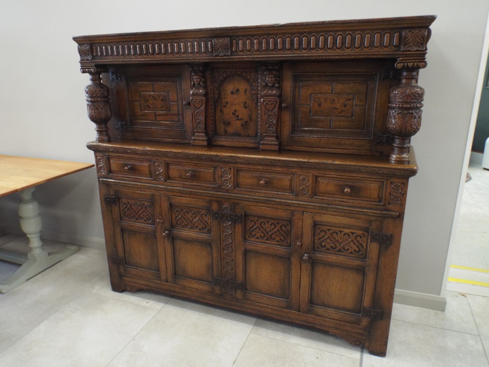 Exceptional Quality Carved Oak & Inlaid Court Cupboard