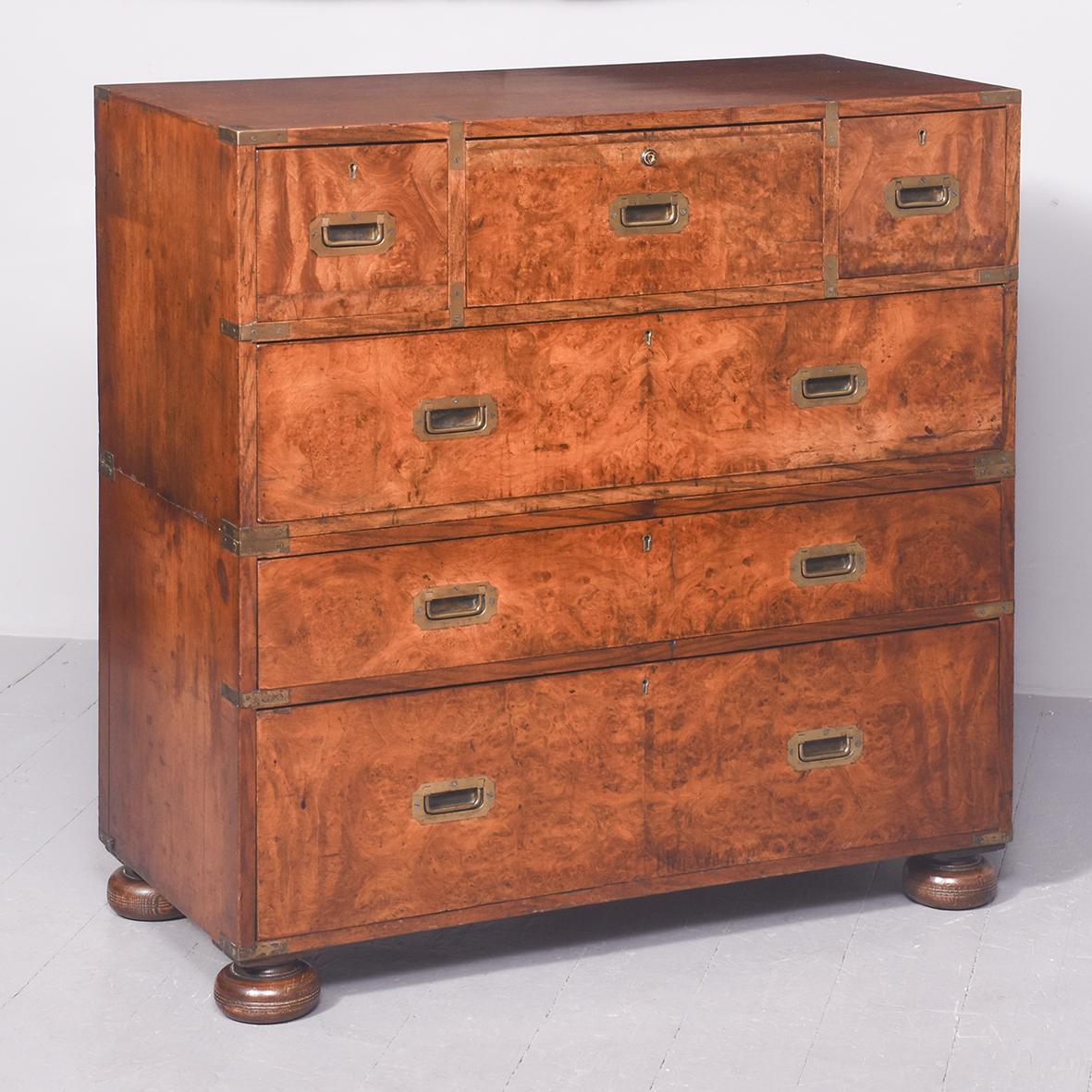 Exceptional Victorian Burr Walnut & Teak Antique Military Secretaire Chest