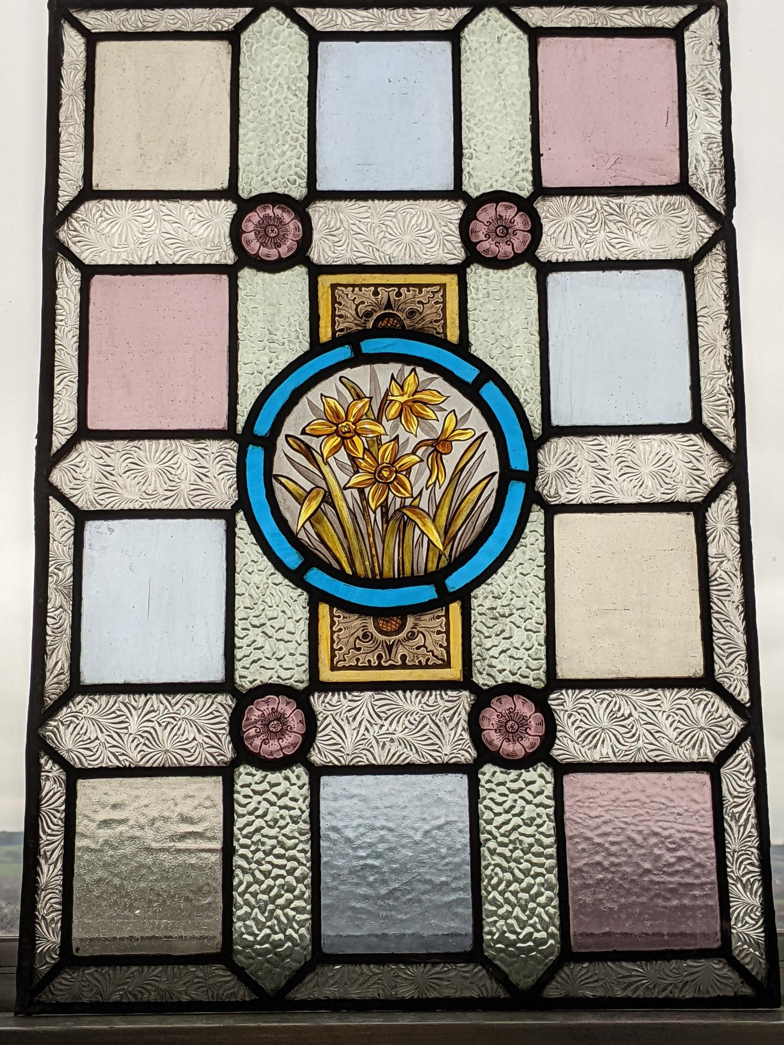 Exceptional Victorian Stained Glass Panel Featuring Hand Painted Daffodils