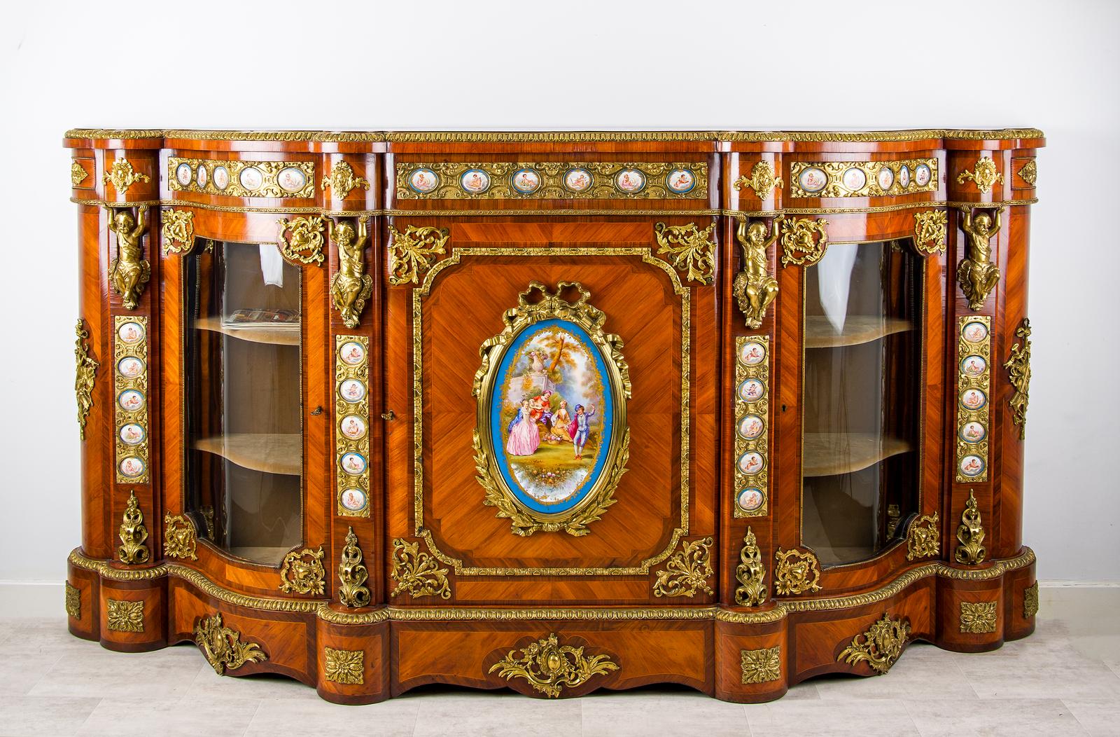 A breath-taking 19th-century kingwood credenza of exceptional quality, richly adorned with Sèvres-style porcelain plaques and finely cast gilt ormolu mounts.
