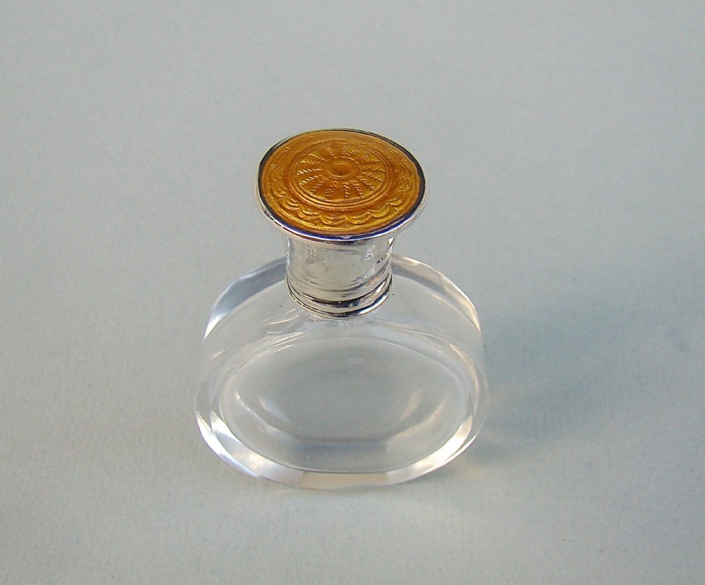 Exquisite Art Deco Silver, Guilloche Enamel & Glass Scent Bottle, London 1922