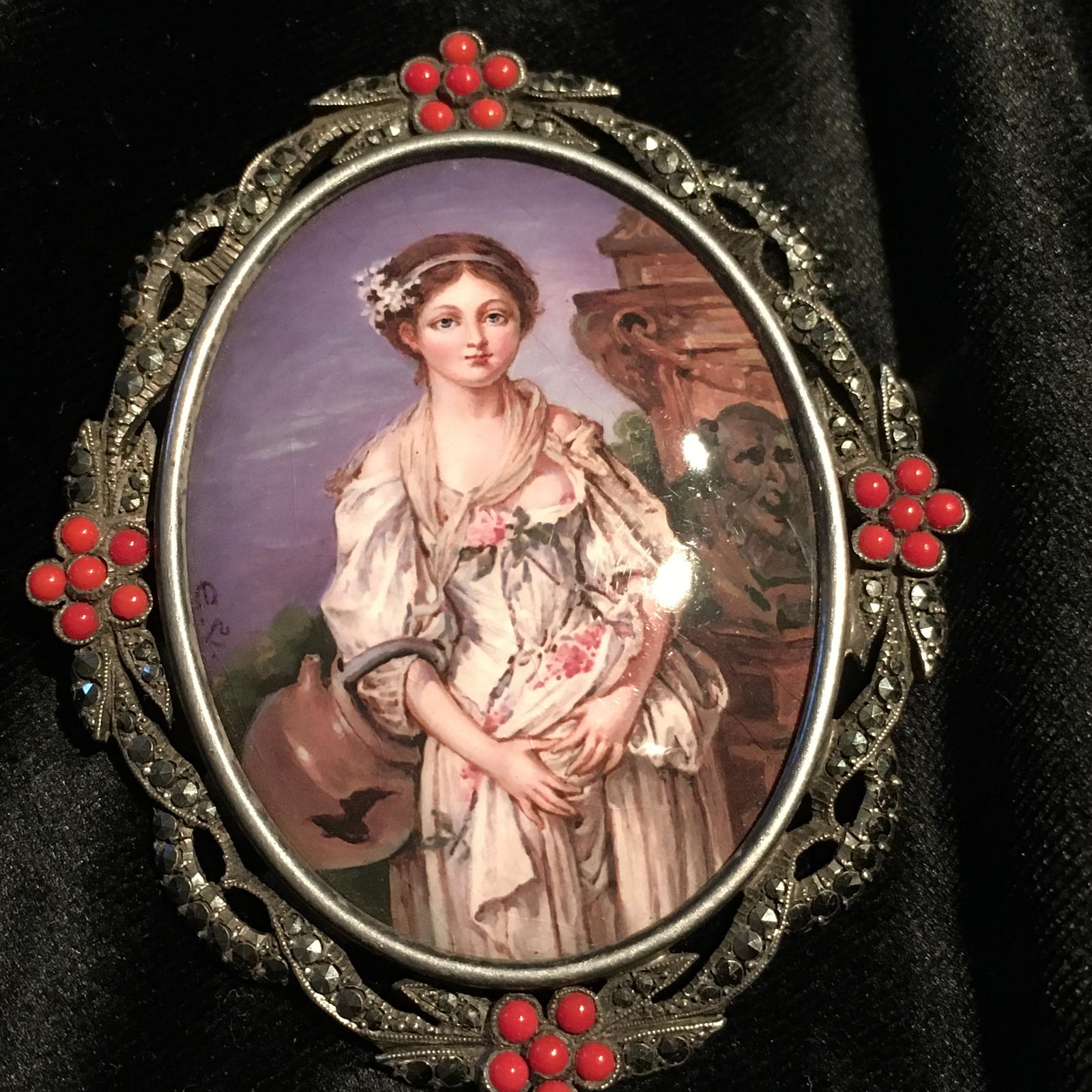 Exquisite Enamel Brooch in Silver Marcasite Mount