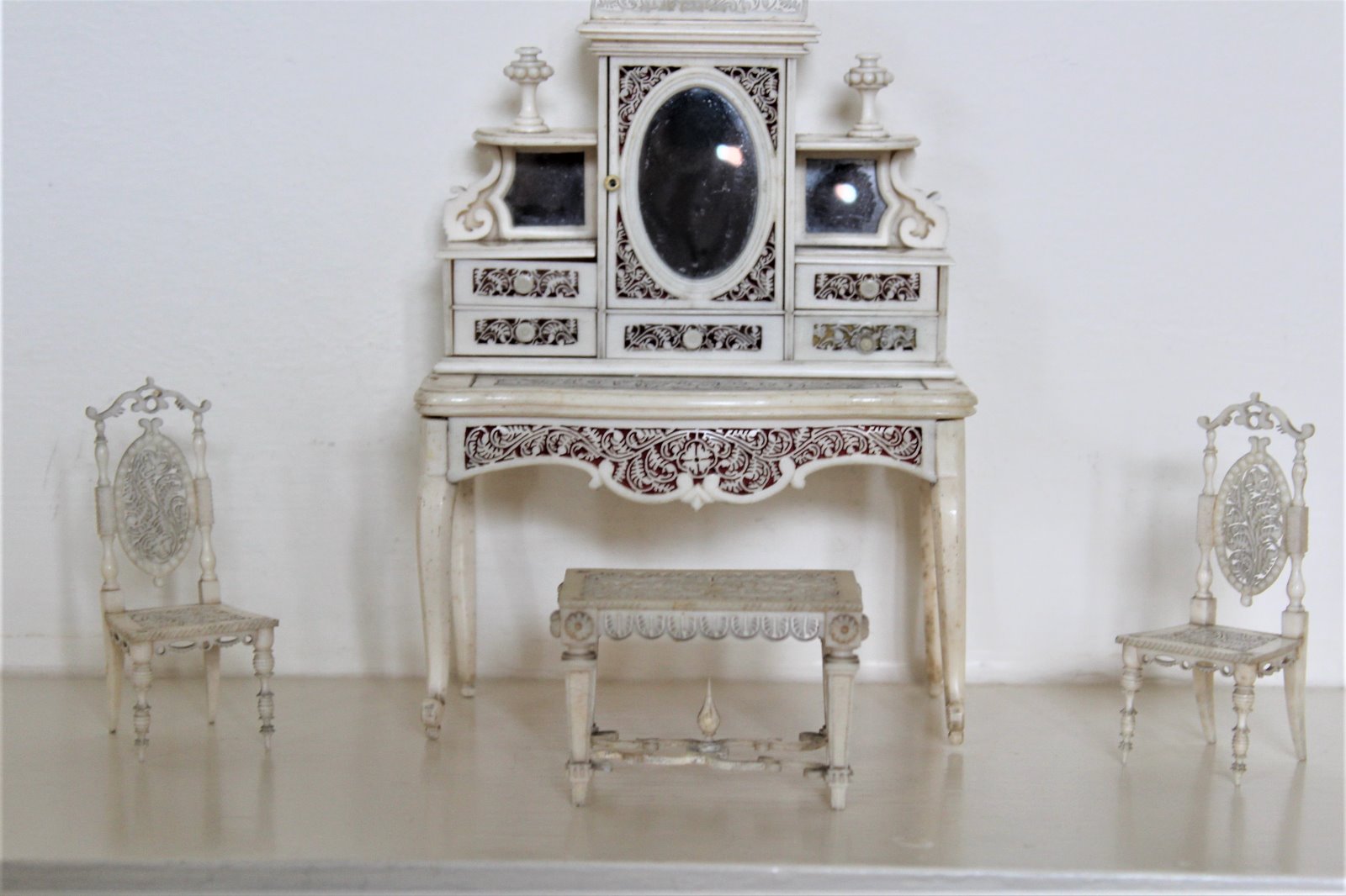 Exquisite French Miniature Boudoir Set Very Finely Carved in Bone Comprising of a Dressing Table a Stool and Two Chairs Would Grace the Interior of Any Superior Dolls House French c.1830-1880