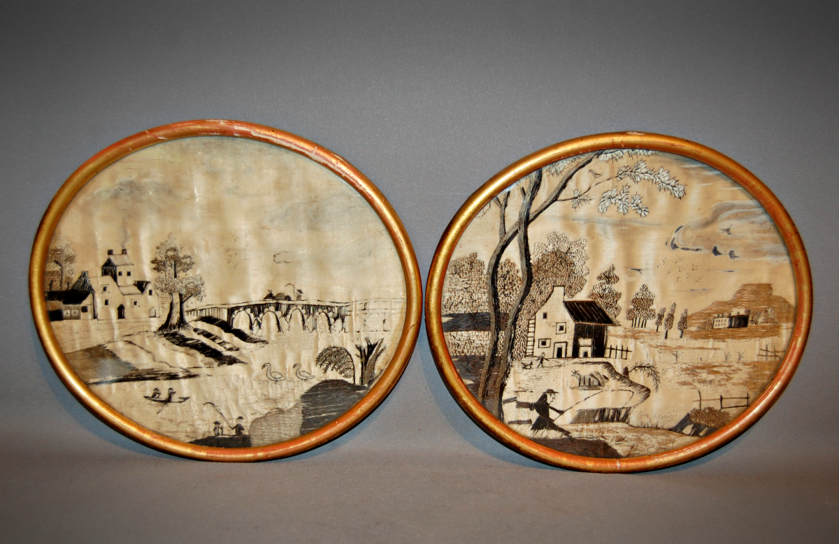 Exquisite Naïve Pair of 18th Century Silk Embroideries