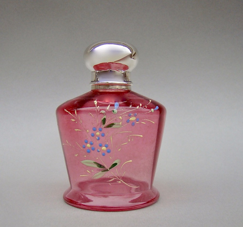 Exquisite Silver Mounted Enamelled Cranberry Glass Scent Bottle Chester 1910