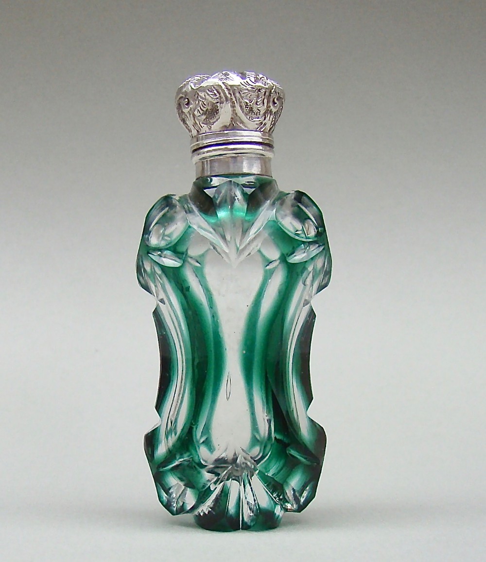 Exquisite Victorian Silver & Bohemian Green Overlay Glass Scent Bottle c.1890