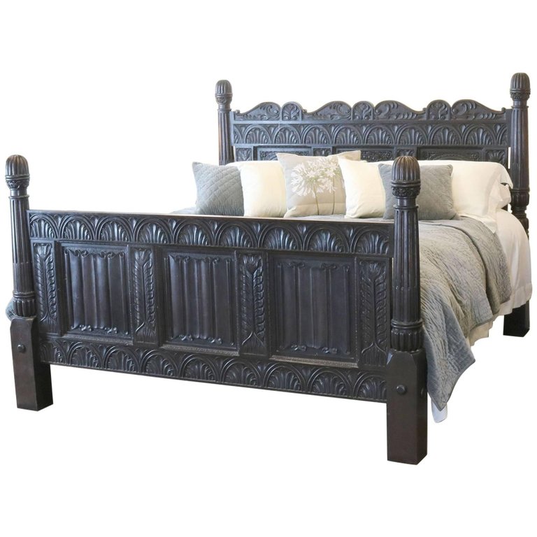 Extra Wide Ebonized Carved Jacobean Style Bed c.1950