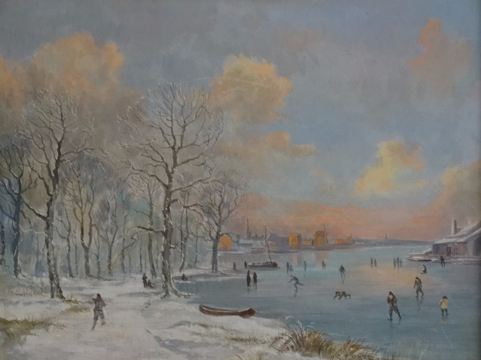 Fabulous 1920'S Dutch Flemish Frozen Landscape Ice Skating Oil Painting