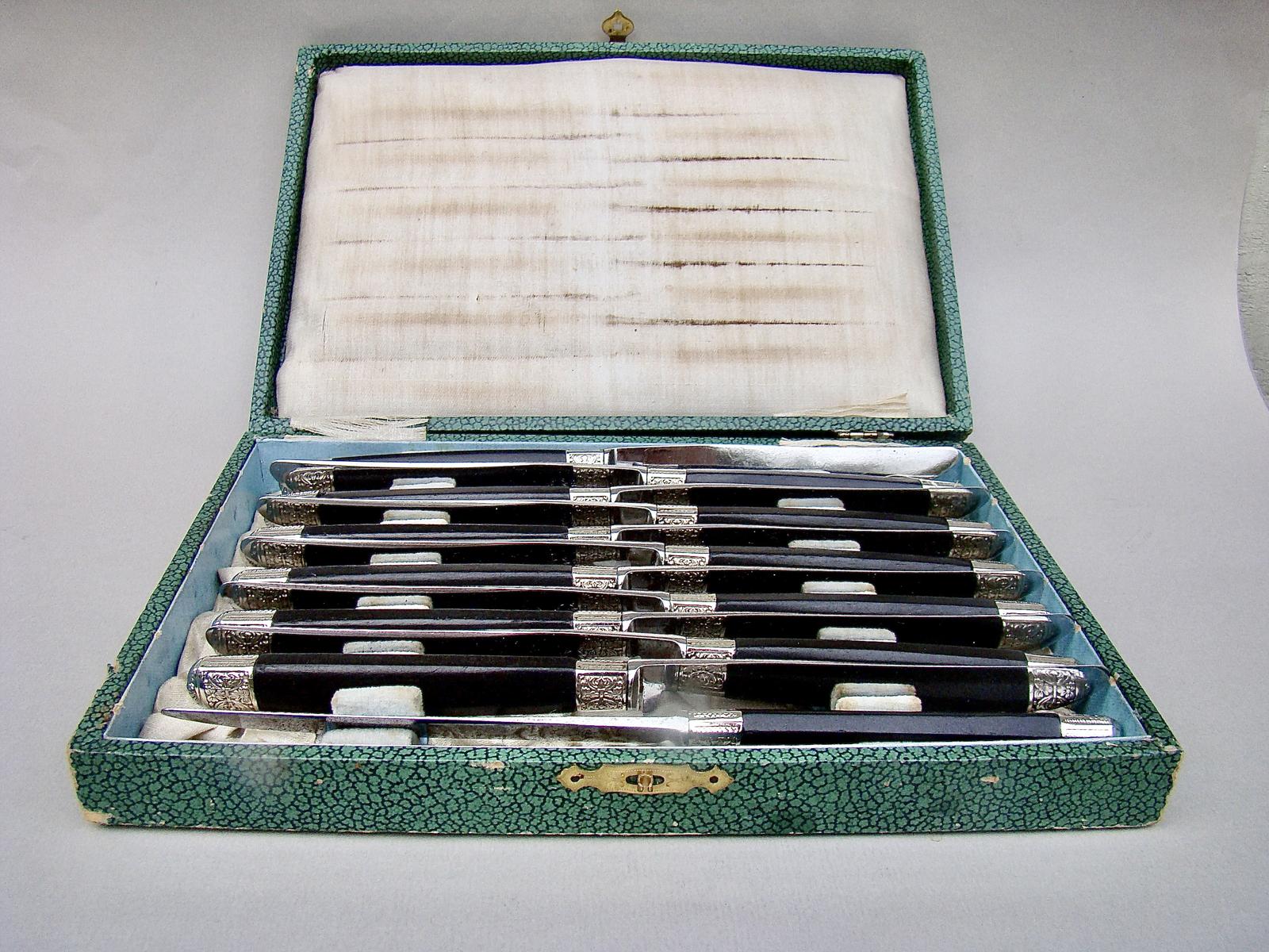 Fabulous Cased Set of Twelve Silver Plated French Small Knives with Ebony Handles & Steel Blades, Paris c.1890