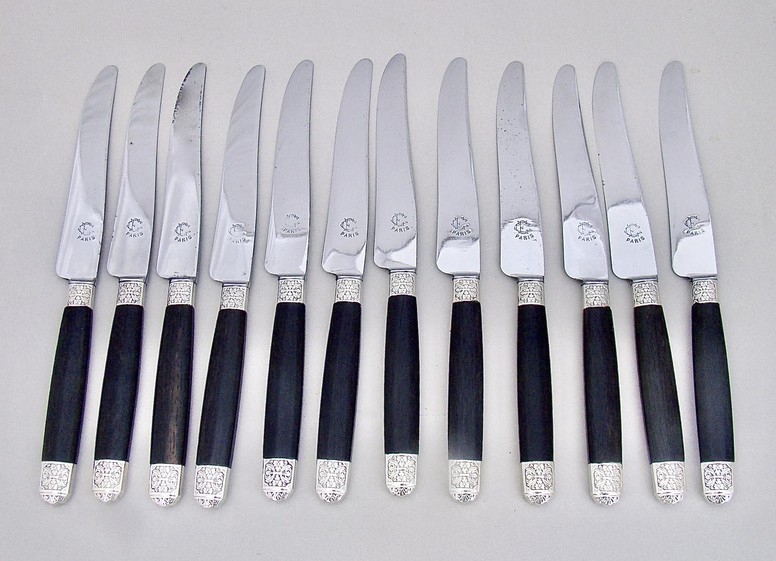 Fabulous Cased Set of Twelve Silver Plated French Table Knives with Ebony Handles & Steel Blades, Paris c.1890