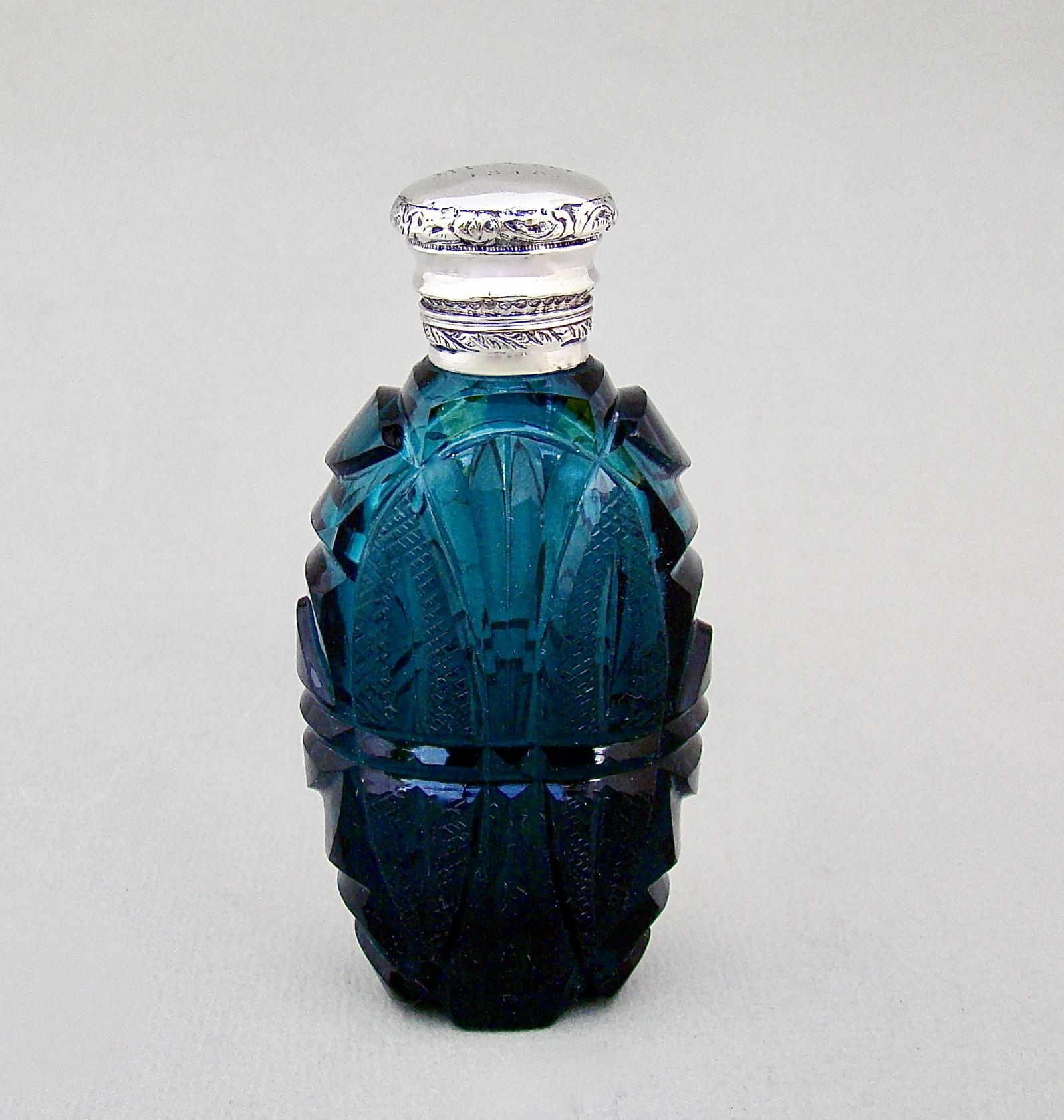 Fabulous Early Victorian Silver Mounted Sliced-cut Teal Glass Scent Bottle, Dated 1848