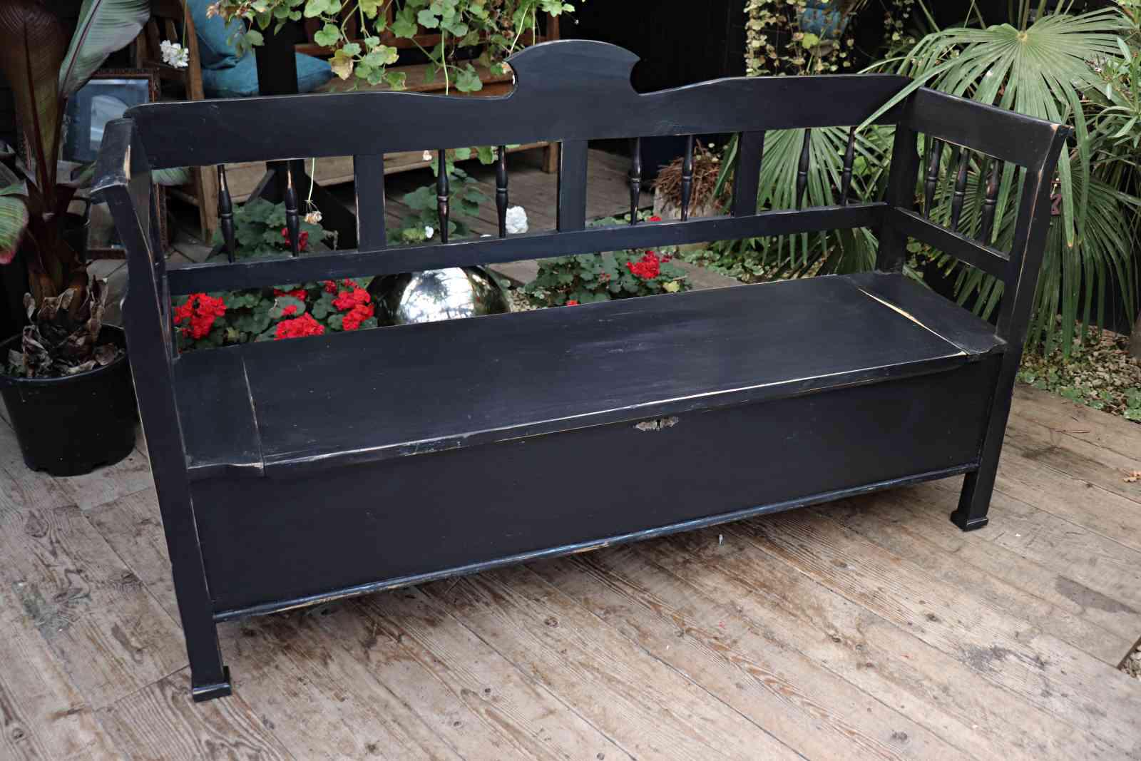Fabulous Old 6ft Pine & Black Painted 'hungarian' Box Bench