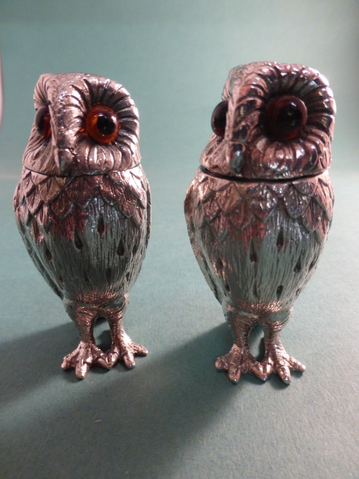Fabulous Pair of Cast Silver Owl Salt & Pepper Shakers London 1962 R. Comyns