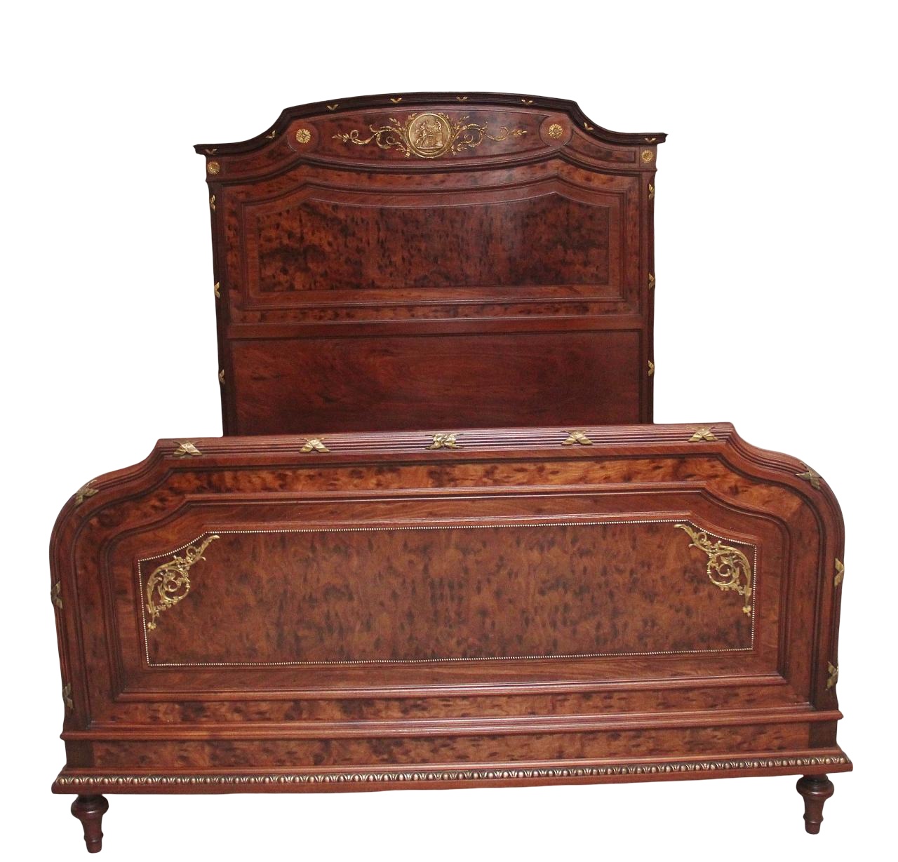 This is a fabulous quality 19th Century French antique plum pudding mahogany and brass bed in the Neoclassical style, the tall headboard having a shaped and reeded top with ormolu decoration, the sides in the same manor as the top but with canted corners, the large panelled front showing the wonderful figuration of the plum pudding mahogany, circular ormolu patraes with a highly decorative ormolu mount at the centre incorporating a large circular plaque depicting a scene with two figures and two cherubs, the foot board is in exactly the same style as the headboard but with ormolu moulding at the bottom, this same ormolu moulding is on the two side rails, supported on four short turn feet.