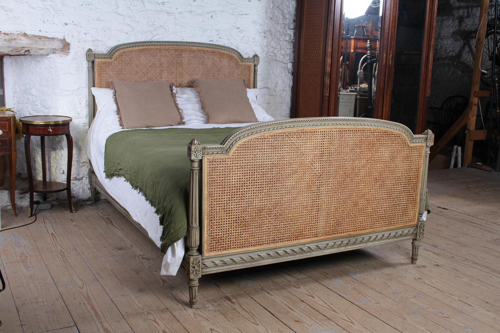 Strong cane work renewed and waxed to preserve. Sympathetically restored with rails extended to support modern length king size mattress 5’ x 6’6” / 150cm x 200cm