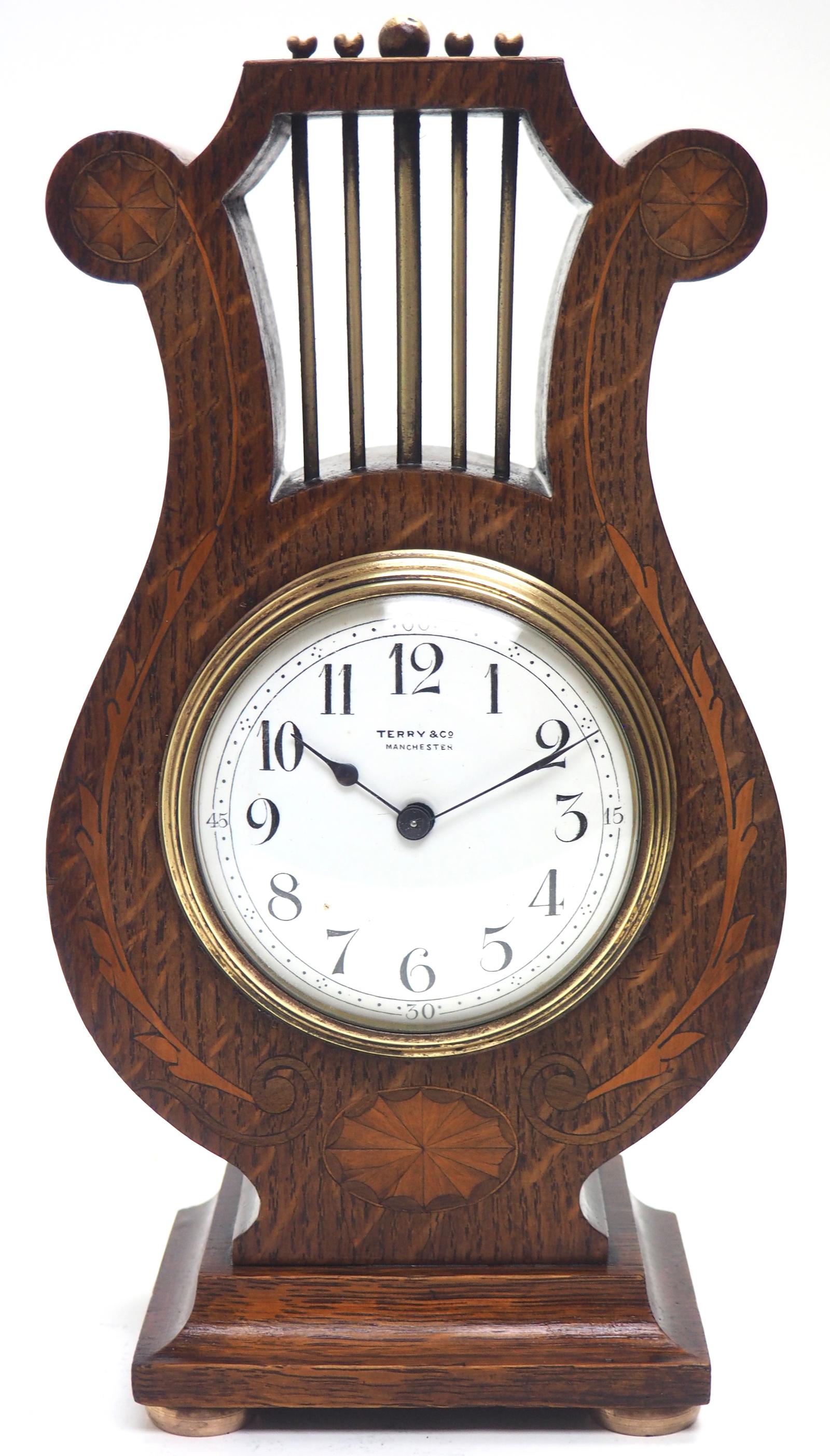 Fantastic Art Nouveau Lyre Shaped Solid Oak Timepiece Clock with Satinwood Inlaid Decoration (1 of 13)
