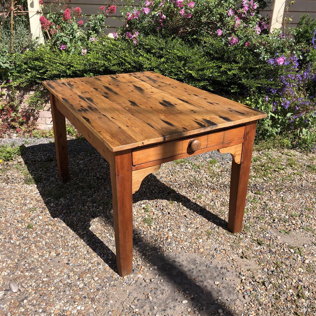 Farmhouse Country Pine Kitchen Dining Table with Plank Top & Drawer