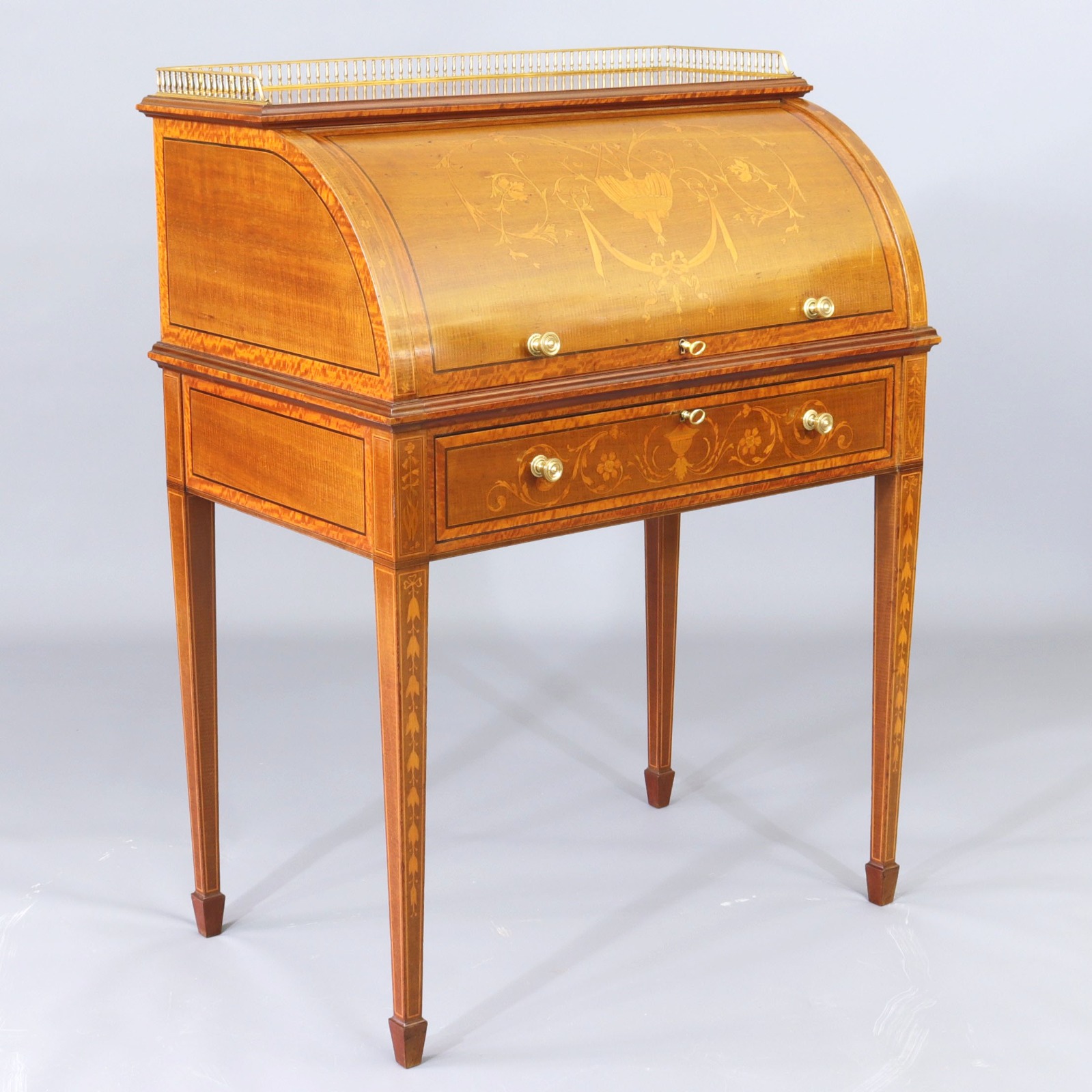 Fiddleback Mahogany and Satinwood Marquetry Inlaid Cylinder Top Desk c.1900