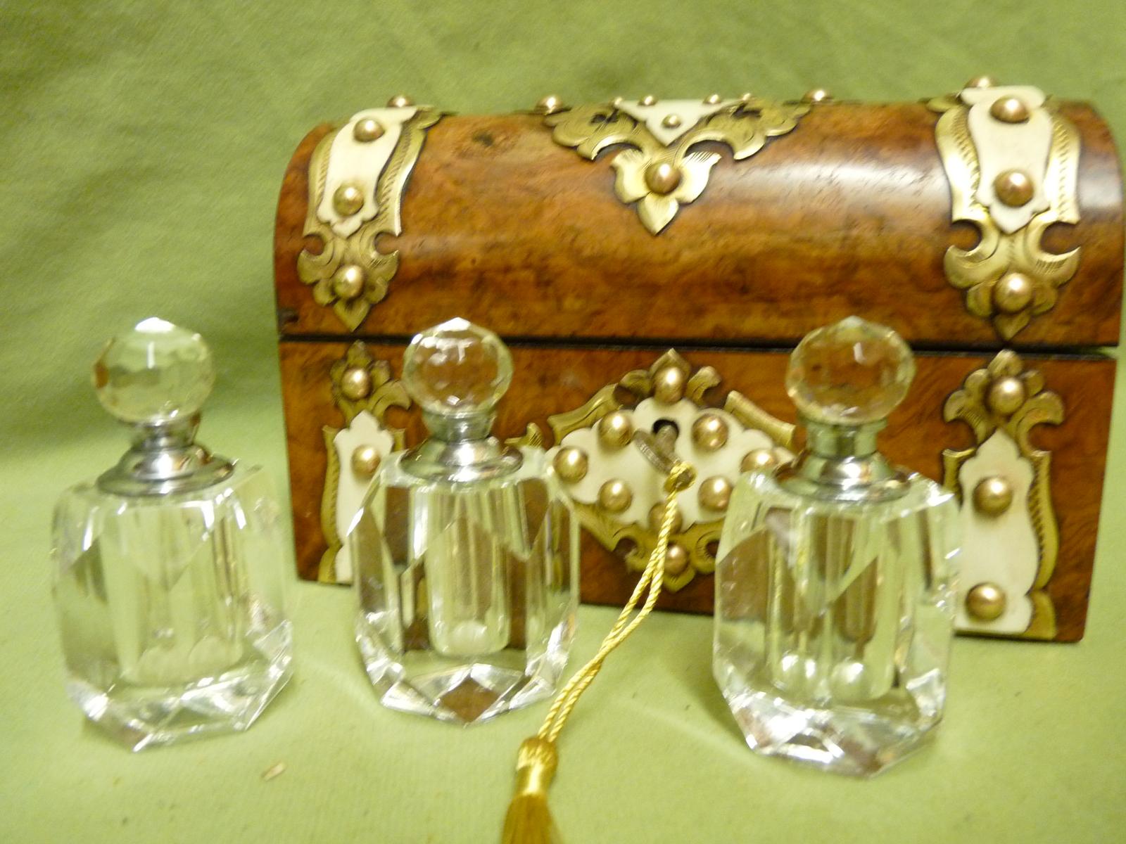 Figured Walnut Dome Top Scent Bottle Box + Bottles c.1875