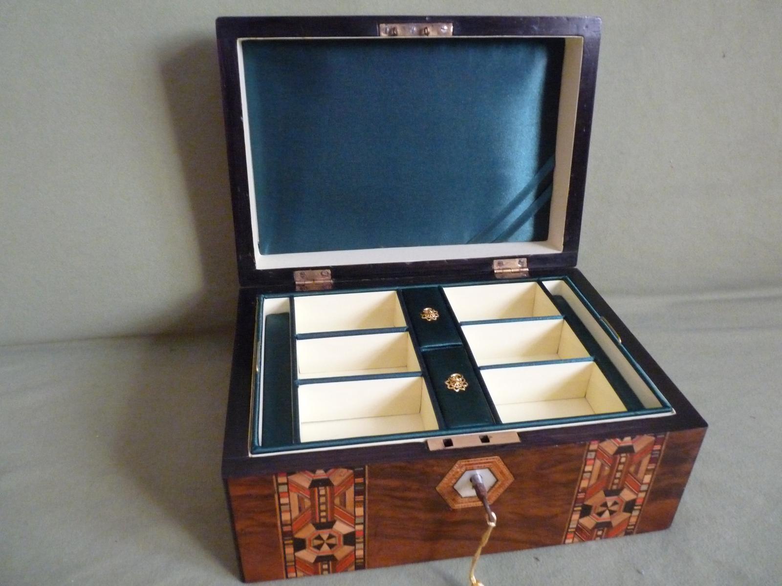 Figured Walnut + Tunbridge Ware Style Inlays Jewellery Box + Tray c.1880