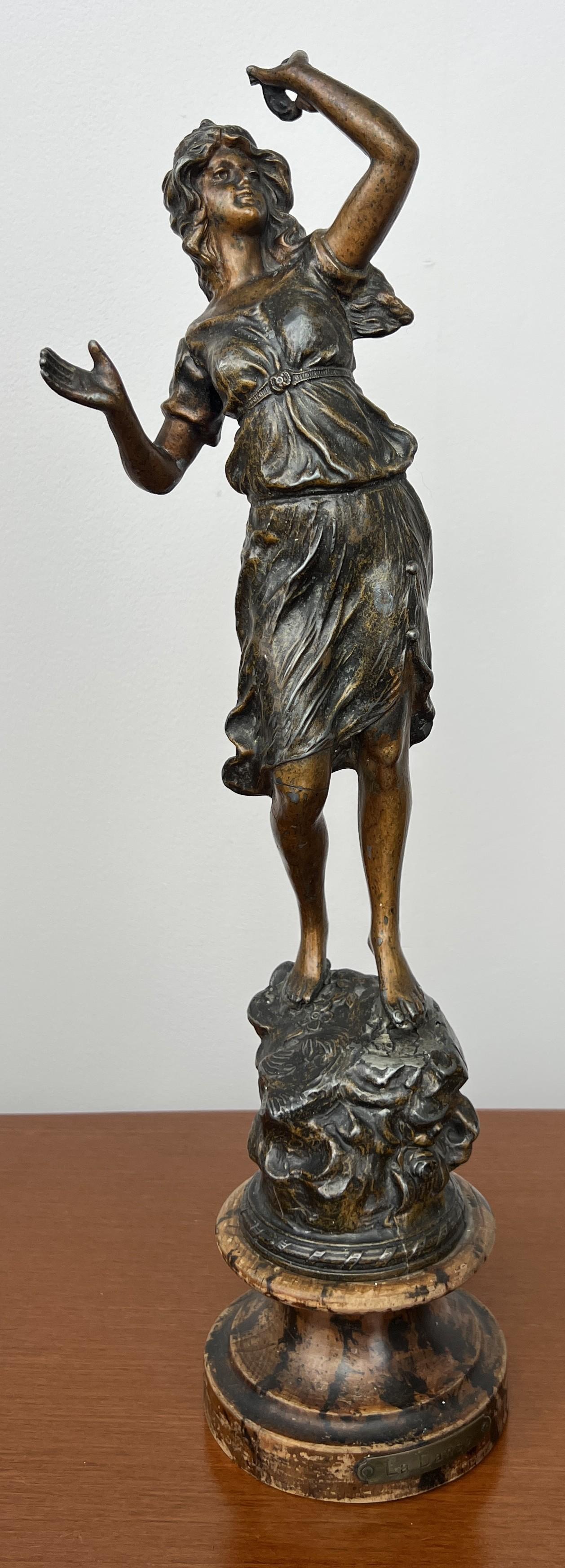This finely detailed metal figurine showcases a beautifully modelled female form with flowing dress folds and expressive posture. The aged finish gives depth and warmth, while the sculpted base adds visual interest and balance to the overall composition.
