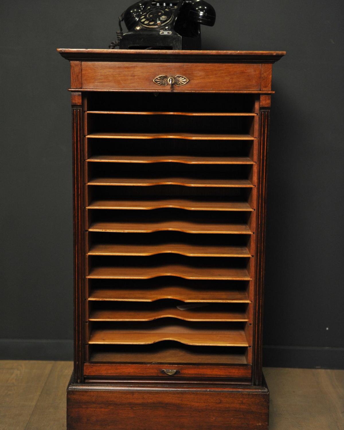 Filing cabinet in wood, from the 50s with a roller shutter