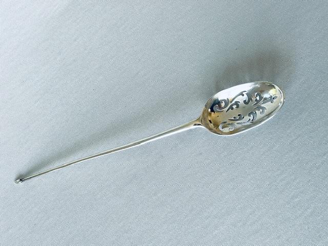 These rare items are much sought after by collector's This lovely example has the traditional oval bowl with cross foliar piercing. The handle is straight and has a steeple finial at the terminal. Unusually, the reverse of the bowl has a rat-tail.