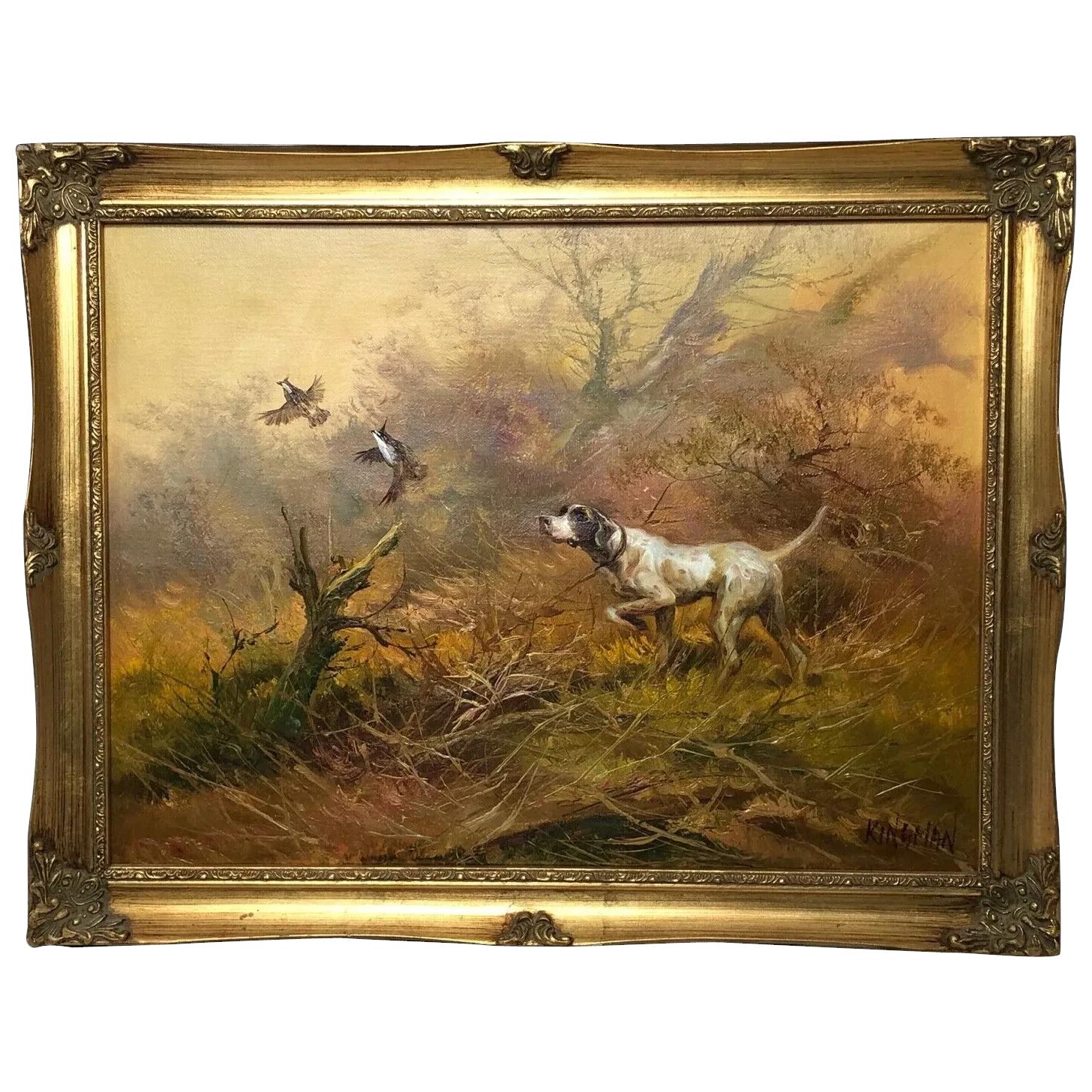 Fine 20th Century Oil Painting Hunting Gun Dog & Grouse In Flight Listed Eugene Kingman