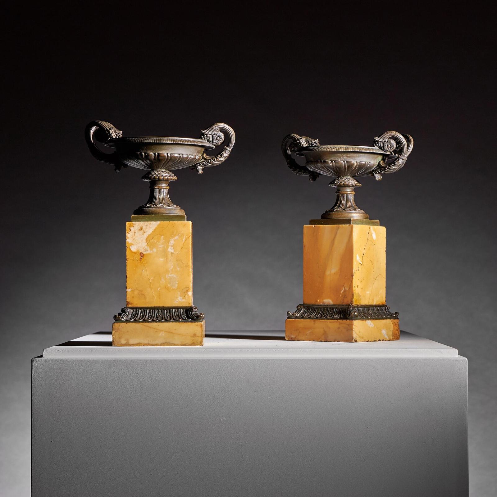 Fine and Large Pair of Early 19th Century Bronze and Marble Tazzas With Cornucopia Handles