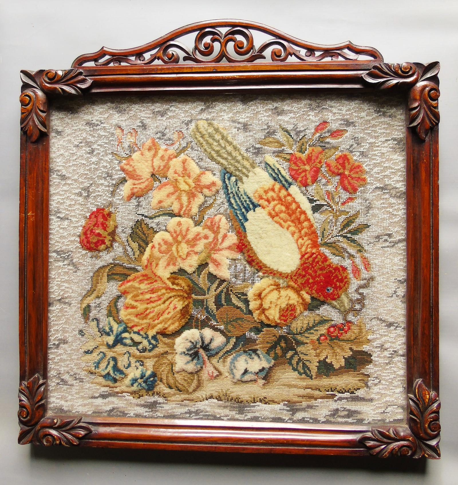 Fine Antique Cut Wool Picture Parrot & Berries