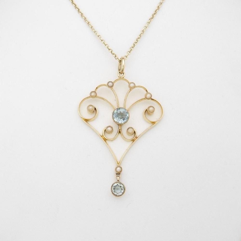 Fine Art Nouveau 9ct Gold Aquamarine & Pearl Pendant